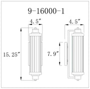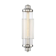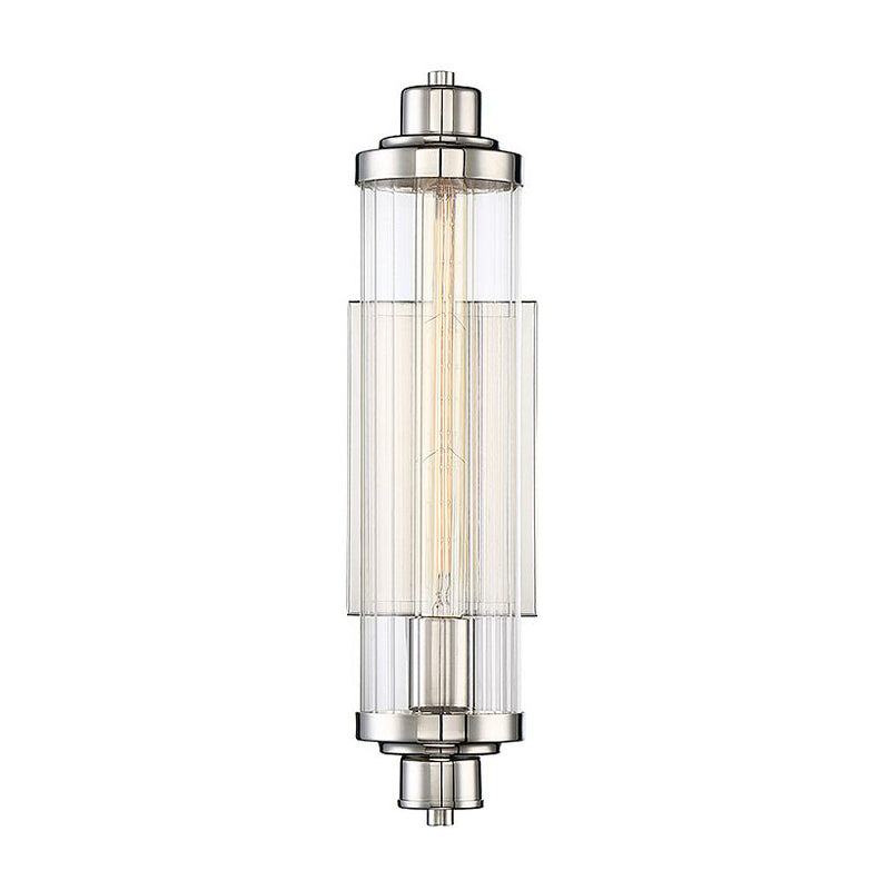 A tall, slim cylindrical shade of clear ribbed glass is supported by minimal hardware and a rectangular backplate in this Savoy House Pike 1-light sconce.
