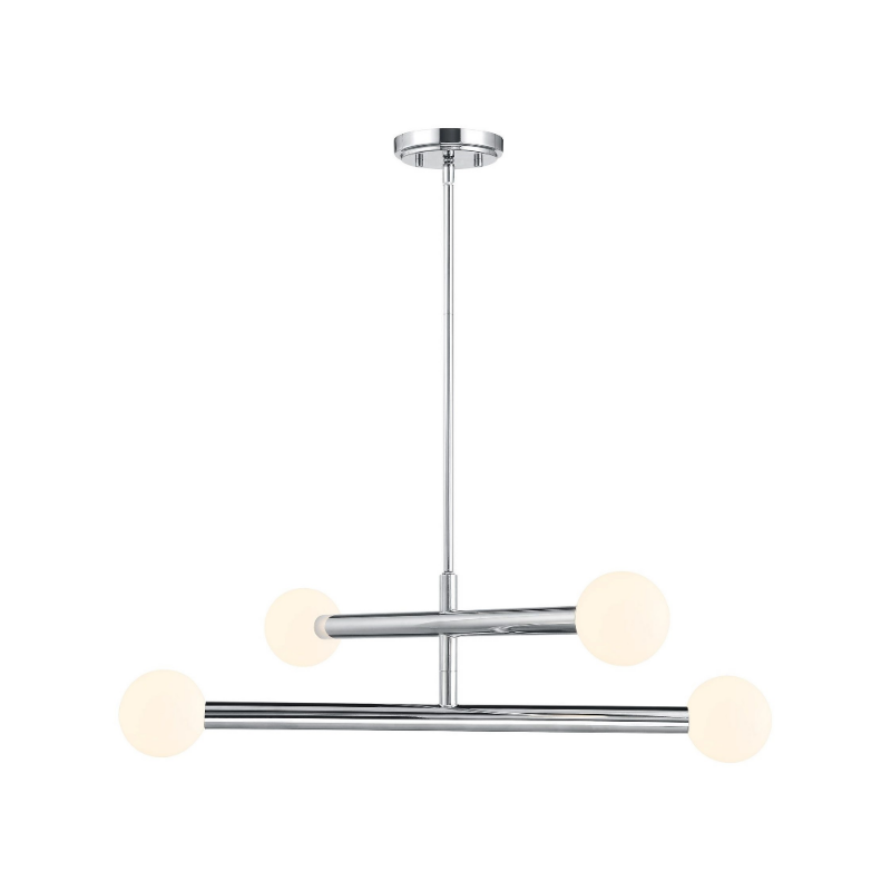 This perky, peppy 4-light chandelier has an understated style that makes a big impact! The light shines from inside orbs of white opal glass and the Chrome finish works beautifully with any decor. You can even rotate the arms for a customized look!