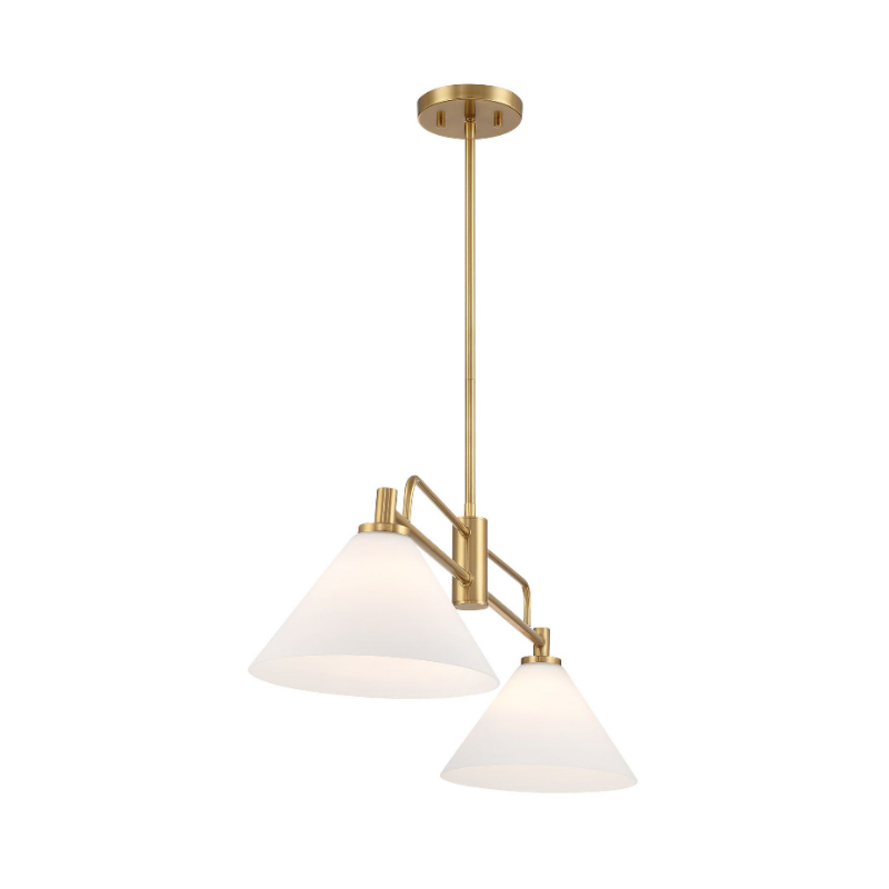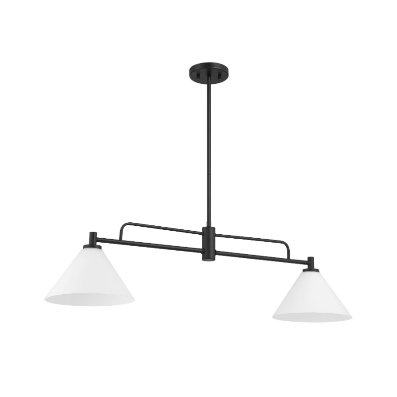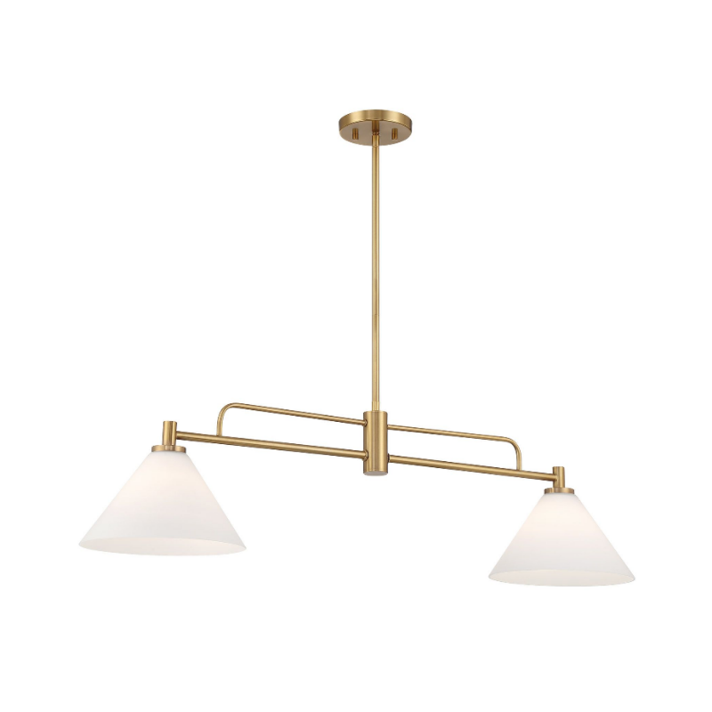 This crisp and elegant 2-light island pendant is a perfect way to illuminate a kitchen island, a long dining table, a billiards room or any other stylish space. Conical shades of opal white glass provide bright, smooth light. Understated detailing, finished in Brushed Nickel, adds a thoughtful touch.