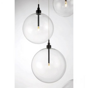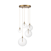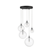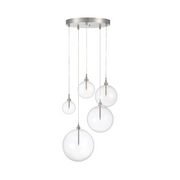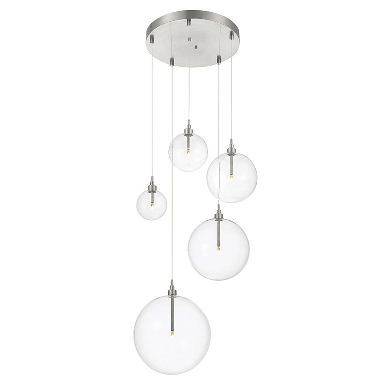 This Meridian 5-light pendant showcases clean, minimal styling with hand-blown orbs of clear glass and a brushed nickel finish. You can adjust the hanging height of each light for total customization! LED bulbs included.