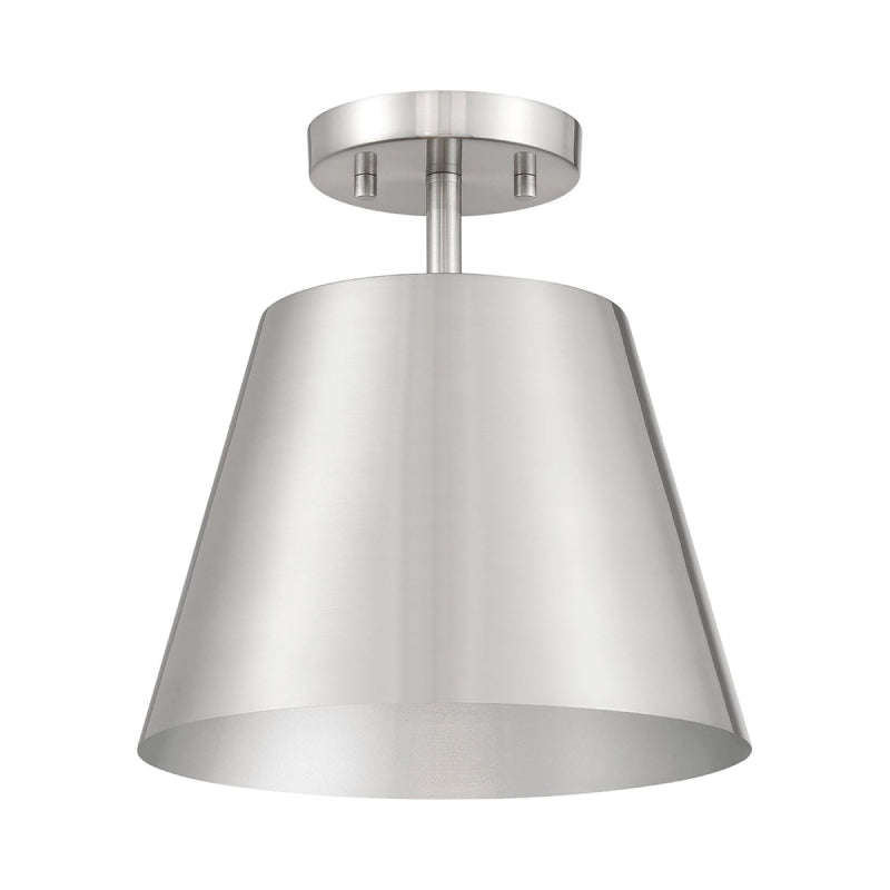 This sleek, chic 1-light ceiling semi-flush mount has a bold solid metal shade to concentrate and direct the light for a bright and dramatic glow.