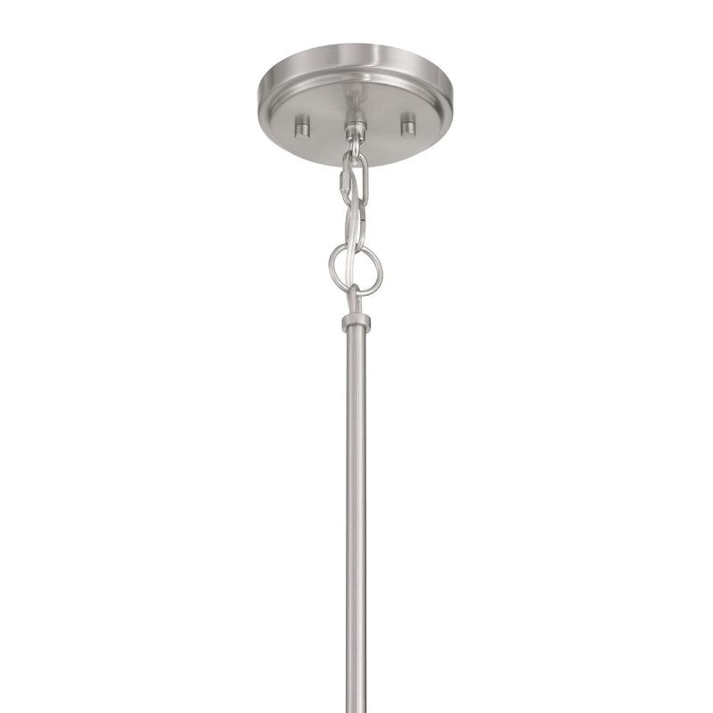 With a crisp white knife-pleat shade, subtle yet thoughtful detailing and a Brushed Nickel finish, this 1-light pendant beautifully brightens up any room.