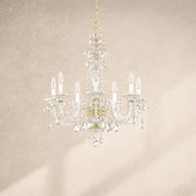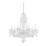In the eighteenth century advances in glassmaking techniques and the demands of rich patrons made all-glass chandeliers the ultimate statement of class. Sterling, an all-crystal chandelier with hand-formed crystal arms and finely cut pendants, column, and dishes, is the ultimate illustration of historical chandelier dazzling by light.