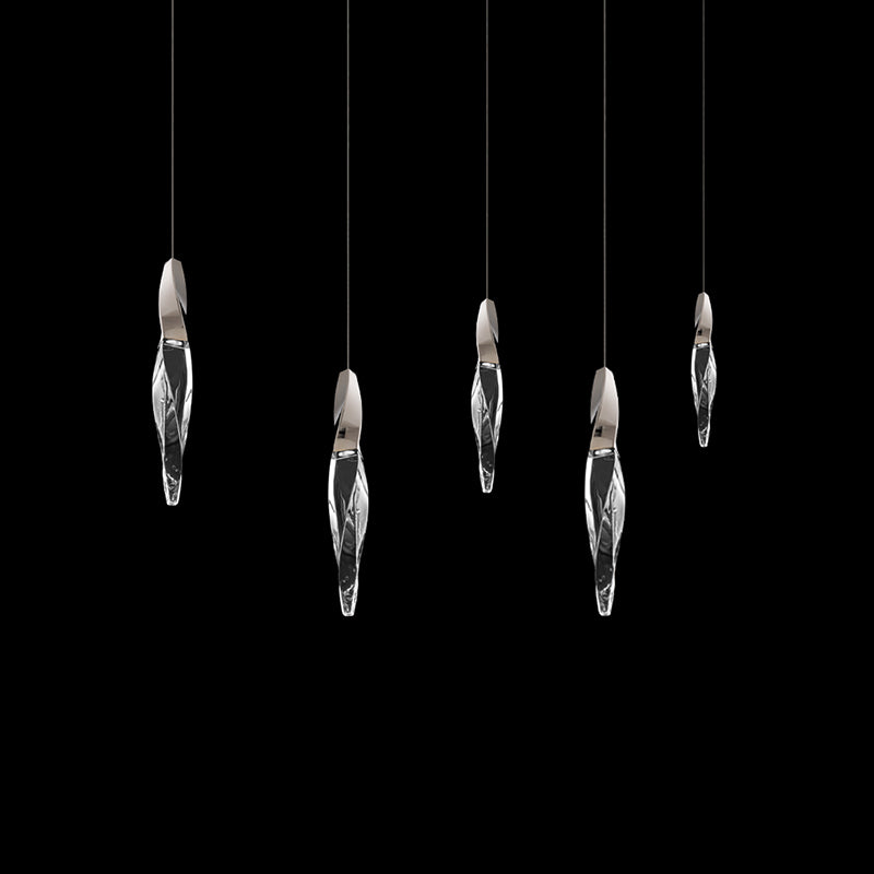 A subtle twist of luxe. Kindjal features exquisite Optic Crystal icicles that twist to a point from a cohesive metal casting, concealing a powerful LED that provide ample illumination. Stylish, textured materiality.
