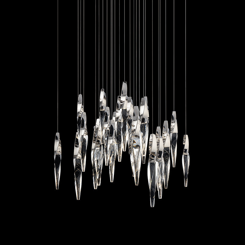 A subtle twist of luxe. Kindjal features exquisite Optic Crystal icicles that twist to a point from a cohesive metal casting, concealing a powerful LED that provide ample illumination. Stylish, textured materiality.