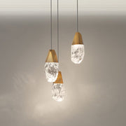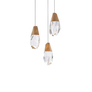 A shower of jewels. Suspended in mid-air, Schonbek optic or optic haze crystal elements composed of natural quartz gemstone illuminate at varying heights to entice. Cascading from above and perfectly designed for over breakfast tables or nightstands in a bedroom to make a powerful yet elegant statement.