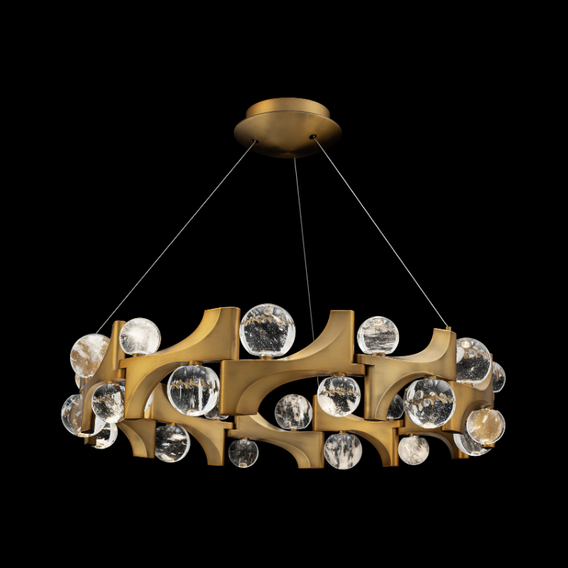 Unleash your artistic side with the Schonbek Beyond Amorina crystal lighting collection, a harmonious blend of graphic structure and organic beauty. Featuring a double row of luminous Optic Haze® Quartz orbs suspended within bold, thick metal bands, this striking design is a true statement piece that transforms ordinary spaces into extraordinary experiences.