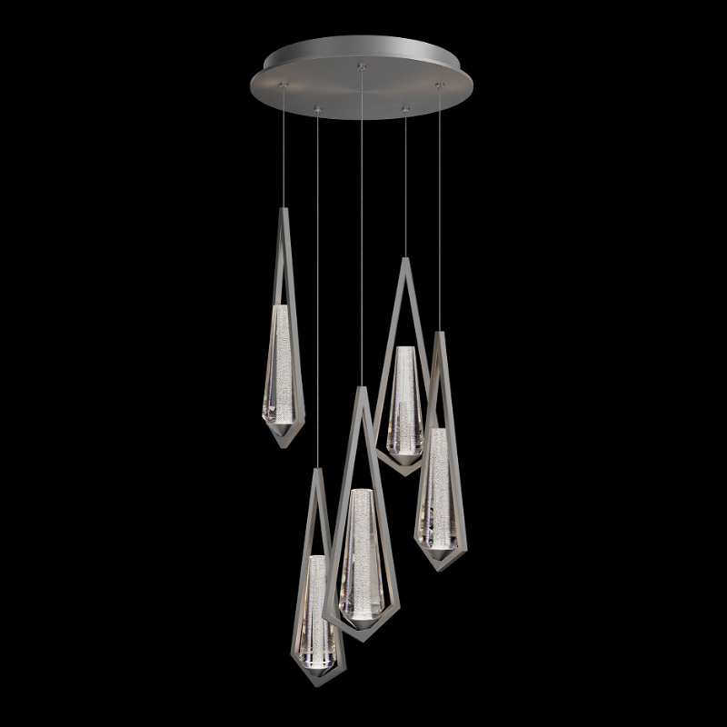 The Devotion multi-light luminaire sparkles brilliantly from five pendants composed of Radiance® Crystal Dust tapers held within triangular frames and installed on one round canopy. This dramatic luminaire creates an artful statement while providing ample lighting to surrounding spaces.