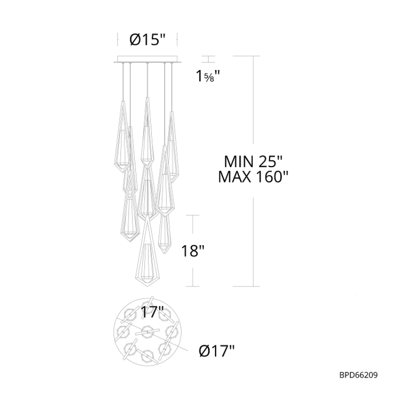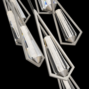 The Devotion multi-light luminaire sparkles brilliantly from nine pendants composed of Radiance® Crystal Dust tapers held within triangular frames and installed on one round canopy. This dramatic luminaire creates an artful statement while providing ample lighting to surrounding spaces.