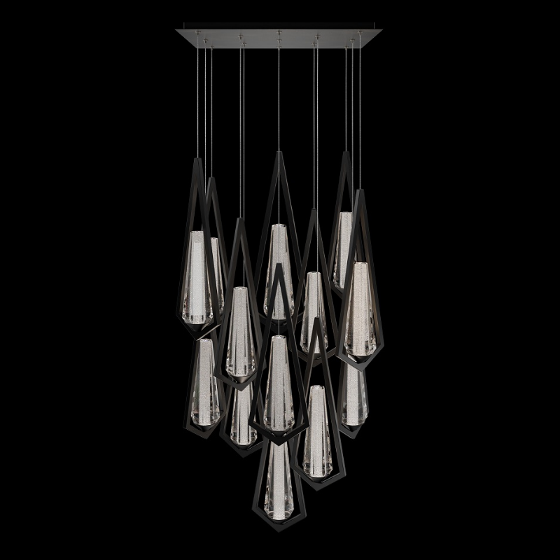 The Devotion multi-light luminaire sparkles brilliantly from thirteen pendants composed of Radiance® Crystal Dust tapers held within triangular frames and installed on one square canopy. This dramatic luminaire creates an artful statement while providing ample lighting to surrounding spaces.