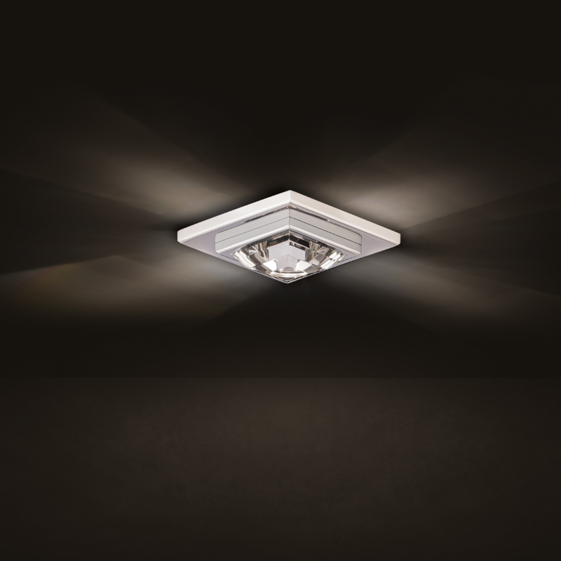 Shining like a princess-cut diamond, a featured faceted Schonbek Radiance Crystal accent creates a lovely refractive effect on the ceiling from integrated LEDs that deliver outward and downward illumination.