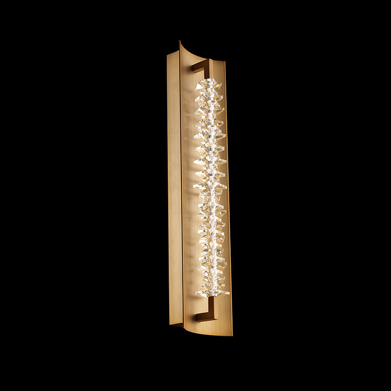 Bold and unapologetically modern, the Bergy crystal wall sconce pushes the boundaries of elegance with its sharp, linear design and precision craftsmanship. The faceted Optic Crystal plates, reminiscent of jagged icebergs, are stacked in a striking formation on a gleaming backplate, delivering a powerful visual statement. Hidden within its core, a line of LEDs injects a sleek glow, amplifying the crystal’s raw brilliance.