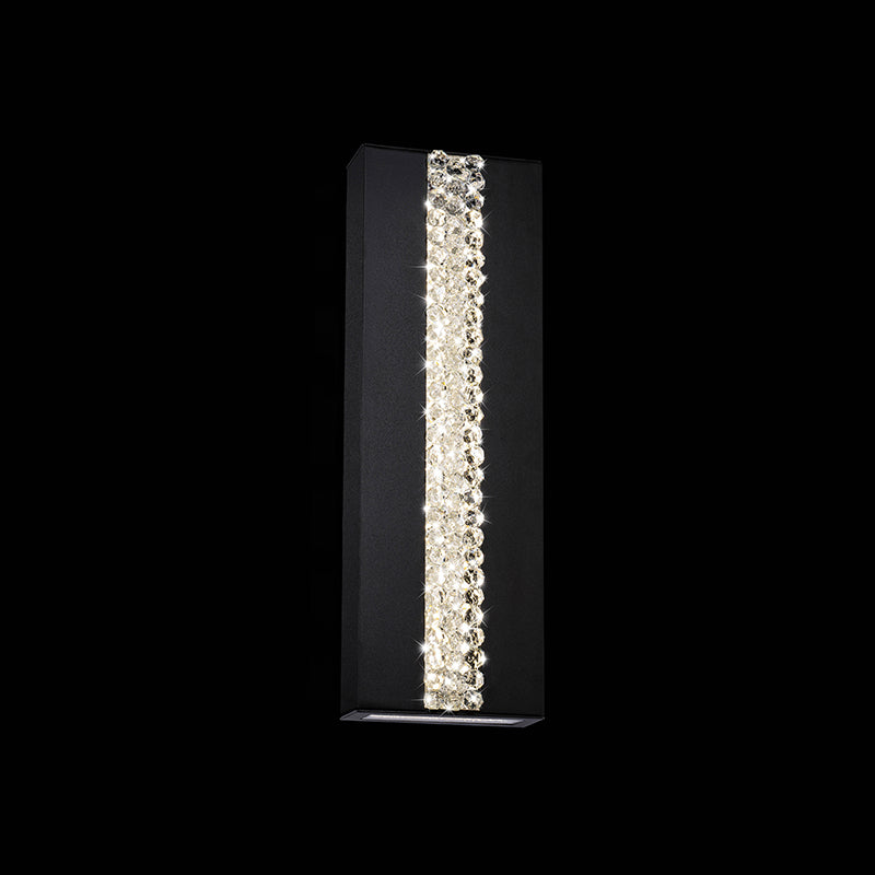 A cascade of infinite, unfolding facets create a multi-layered depth that draws the eye and imagination inward. Sleek metal bars frame chunks of crystal , delivering sparkling LED illumination that lights facades in splendor.