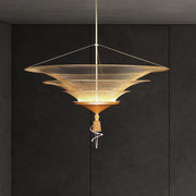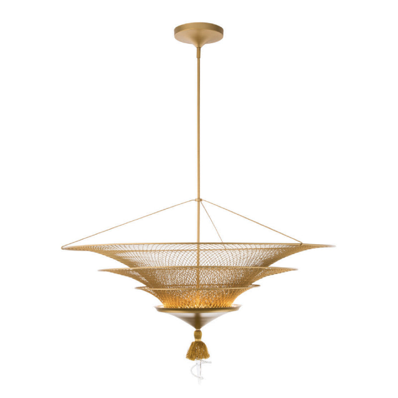 An ovation of visual interest. Three concentric tiers of woven metal thread gleam and shimmer towards the finale to celebrate a featured crystal finial.