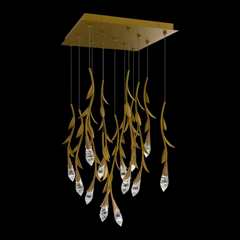Drawing inspiration from the serenity of naturalistic design, Secret Garden pendants showcase luminous Optic Haze® Quartz buds appear to grow organically into elegant flowers. Thirteen pendants are installed on one square canopy to create an artful statement as well as deliver ample lighting to spaces throughout a home or business.