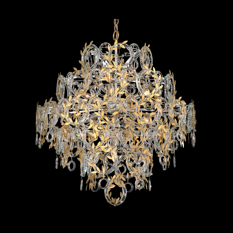 The Concetta pendant is a breathtaking blend of organic beauty and refined artistry, featuring a circular silhouette crafted from concentric tiers of faceted Radiance® Crystal rings. Intricately cut polished metal leaves twine gracefully around each ring like delicate vines, creating a brilliant display of light and texture. This striking design juxtaposes modern luxury with natural elegance.