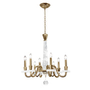 A luxurious symphony of graceful curves with faux candle lights enhanced by a mesmerizing optic haze crystal center and matching orb finial. The stunning chandelier harmonizes in a refined creation and classical elegance.