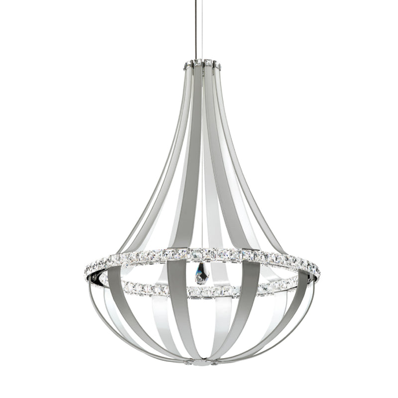 Neoclassical in nature, this draped, leather chandelierâs structure softens the room. Its smooth sheen is punctuated by an iconic Swarovski crystal ring. Its symmetry and proportionality call to those with a modern take and a penchant for history. Often discovered in spiral stairways or over formal dining tables.