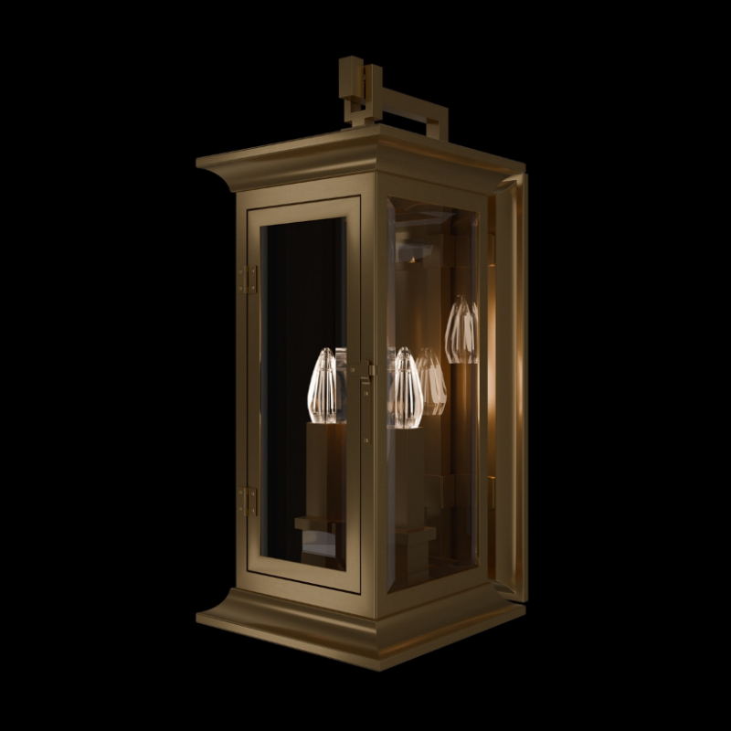 The Dresden small outdoor wall lantern embodies a perfect balance of visual appeal and durability. Constructed of pure brass, its boxed structure features a stepped modern roofline and handle for a contemporary touch. Glass panels enclose the design, protecting the candle lamping within, while the front window openings ensure easy access for maintenance. A beveled mirror on the back wall intensifies the golden glow, creating a radiant and welcoming setting.