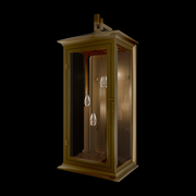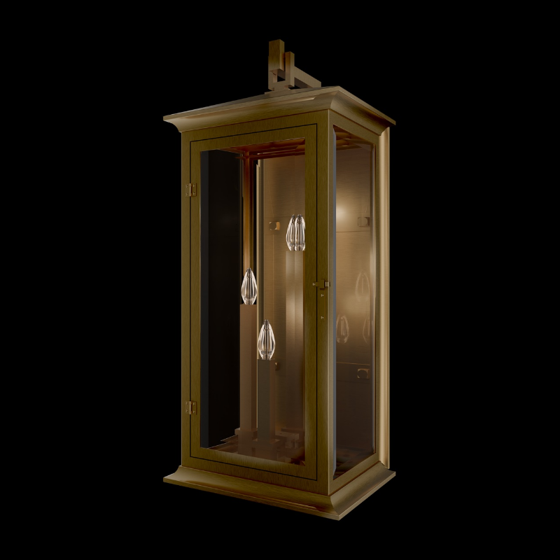 The Dresden large outdoor wall lantern embodies a perfect balance of visual appeal and durability. Constructed of pure brass, its boxed structure features a stepped modern roofline and handle for a contemporary touch. Glass panels enclose the design, protecting the candle lamping within, while the front window openings ensure easy access for maintenance. A beveled mirror on the back wall intensifies the golden glow, creating a radiant and welcoming setting.