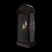 The Villenova medium outdoor wall lantern features a gracefully arched top and beveled frame, all finished in elegant black with subtly burnished edges. Clear beveled glass panels surrounding square candle-style lights lend a modern touch, while a decorative overlay hinge adds a refined, detailed accent. Villenova is perfect for enhancing outdoor spaces with timeless elegance and contemporary flair.