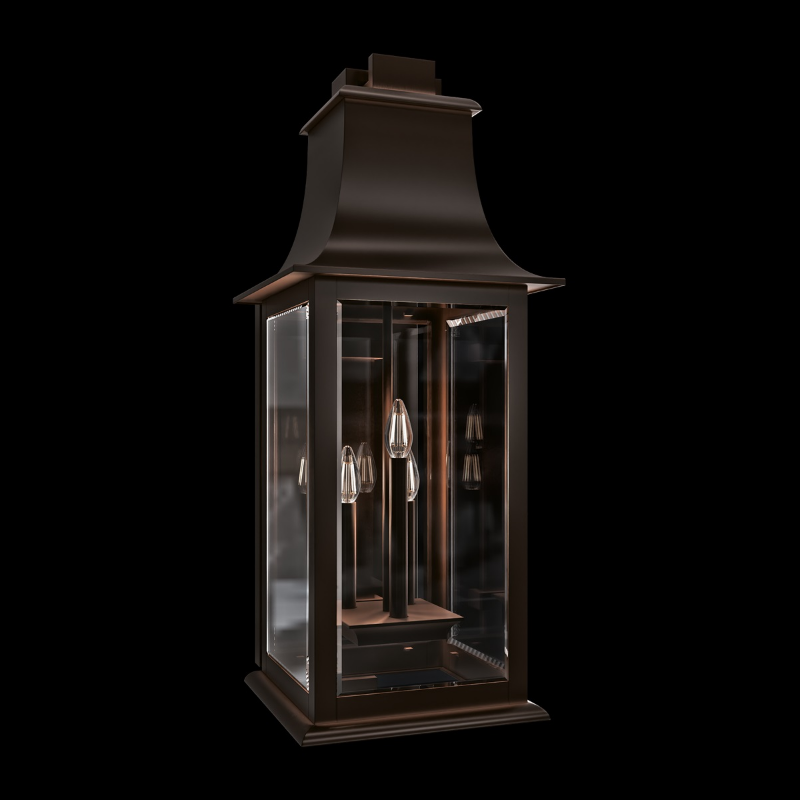 The Proctor large outdoor lantern exudes sophistication with its tall, swooping mansard roof, intricate top detail, and classic silhouette. Clear beveled glass panels encase candelabra-style lights, creating a welcoming glow. Rising from a sturdy base, the elegant design adds height and refinement to any outdoor area.