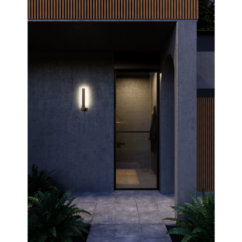The classic modern elegance of straightforward geometry sets a frosted glass rectangle against a crisp rectangular beam, radiating the glow of its LED illumination.