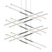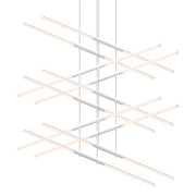 LED rods are suspended in tandem pairs on multiple levels, perpendicular to each other. Each rod can be independently positioned as up or down light, and adjusted with infinite variability to any height along the suspension cables. Dramatic in the precision of their orientation and range of verticality, Tik-Tak brings a crisp presence to the volume of space.
