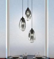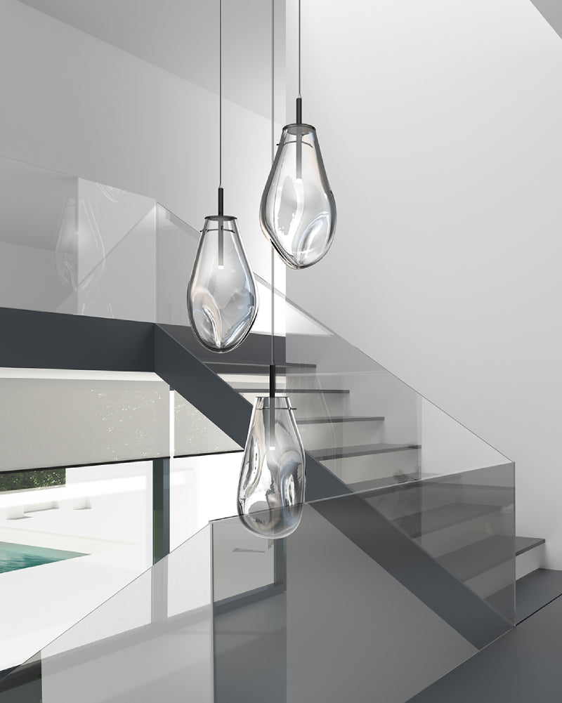 Liquid Chandelier is available in clear, smoke fade, and poured white glass. They can be hung individually, in multiples, or with spreaders to form larger arrangements.