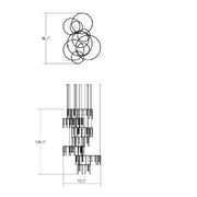 Suspended one below another in slightly offset arrangements these Power Bar rings form a configuration of vertical volume. Suspended around the circumference of each ring are alternate lengths of Ladder Lights Luminaires which fill the vertical voids with dazzling arrays of sparkling LED illuminated acrylic crystals.