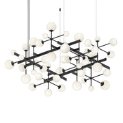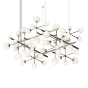 Intersecting stems form clusters of illuminated glass spheres in a dance-like rhythm. Mounted in precisely poised positions along rectangular beams in linear and rectilinear configurations of expansive scale, these Nebula constructions form illuminating sculptures of joyous activity in dramatic scale and proportion.