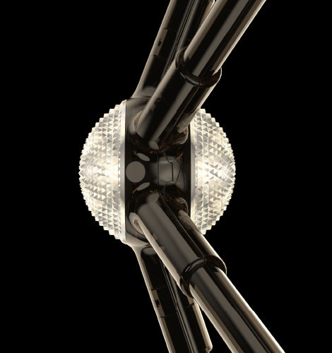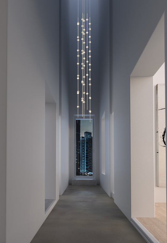 Constellation, a new system of architecturally scalable, interconnected compositions of dazzling sculptural illumination. LED hubs connected in linear strands of various lengths are suspended to from dramatically powerful luminance within a vertical space.