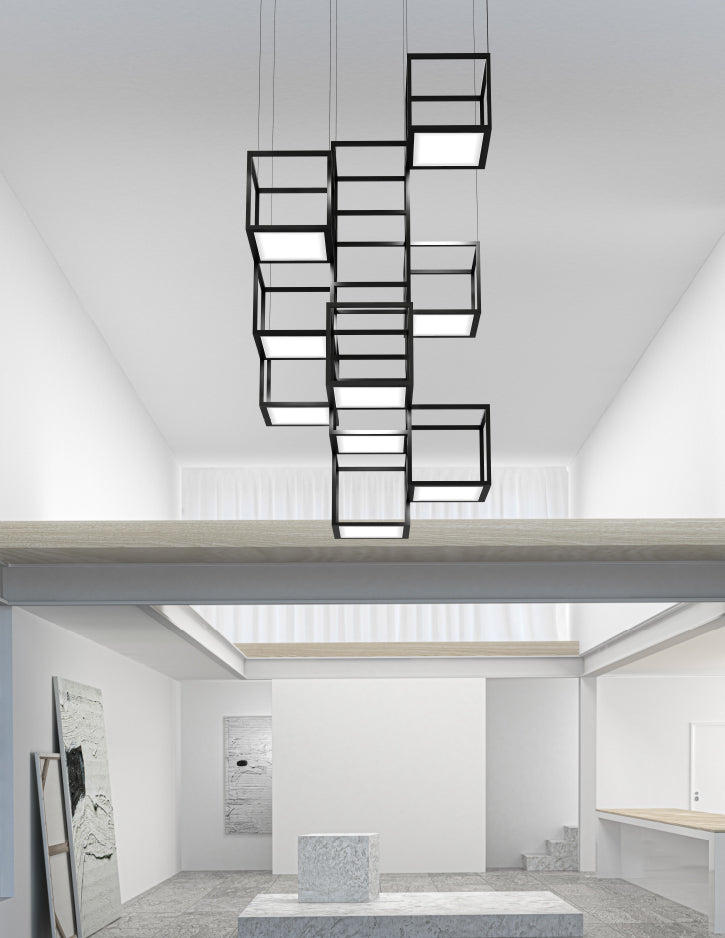 Cubix brings scalability, volume, and constructive interest to architectural illumination. Arrayed in precisely interconnected relationships, these suspended cubes are joined to each other by a shared leg on each frame.