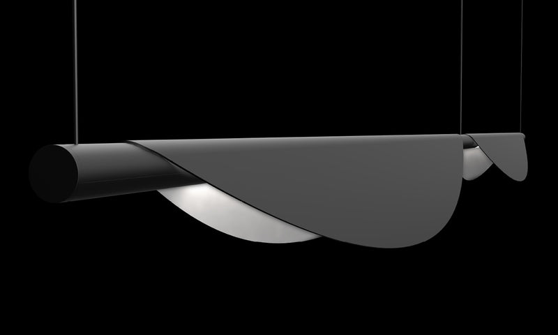 Elegantly draped along the axis of a tubular LED source, this flowing reflector directs the linear illumination downward. Tela can be used singularly or in an end-to-end linear configuration of multiple lengths as desired. Its sophisticated simplicity brings a sculptural flowing rhythm along a surface or within a linear space.