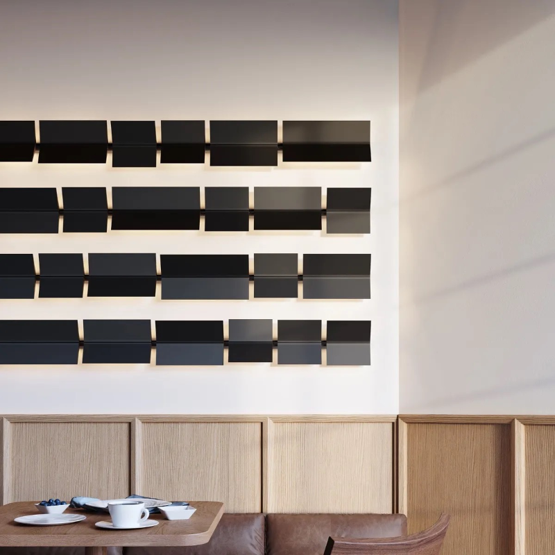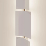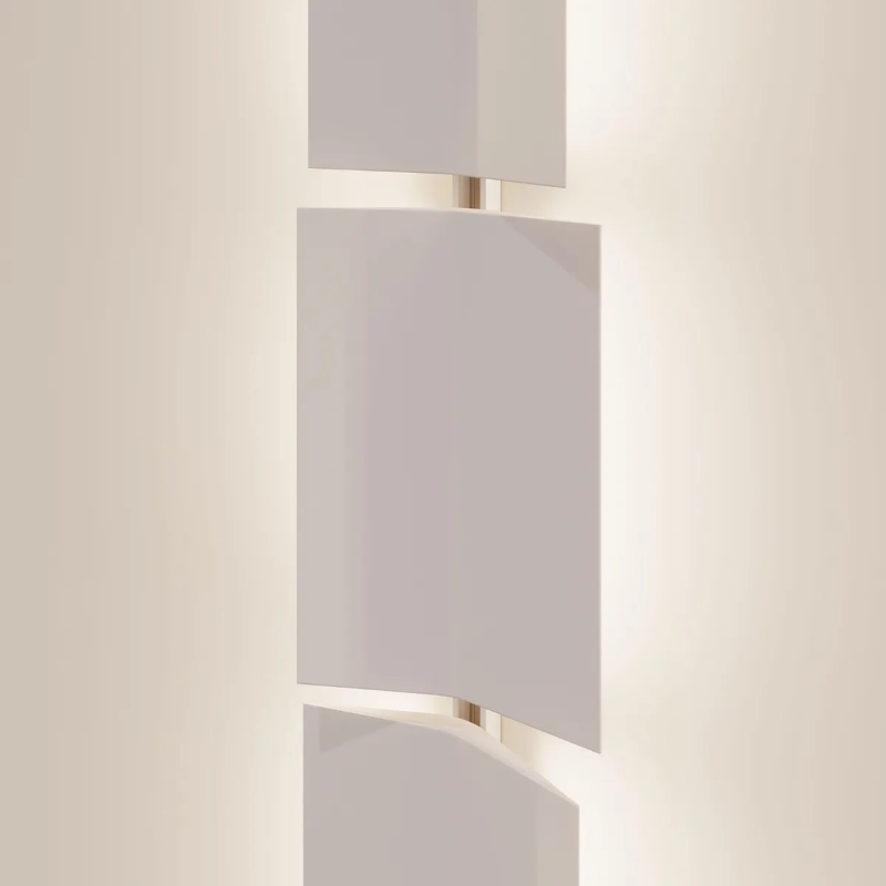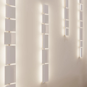 Turo elemental building blocks -- rail bars and modular adjustable LED sconce planes -- create sculptural vertical surface compositional unity with light and shadow. Each wall kit includes three small sconces, two medium sconces, and one large sconce. Turo is also available as a single sconce in multiple sizes in a satin white and satin black finish.