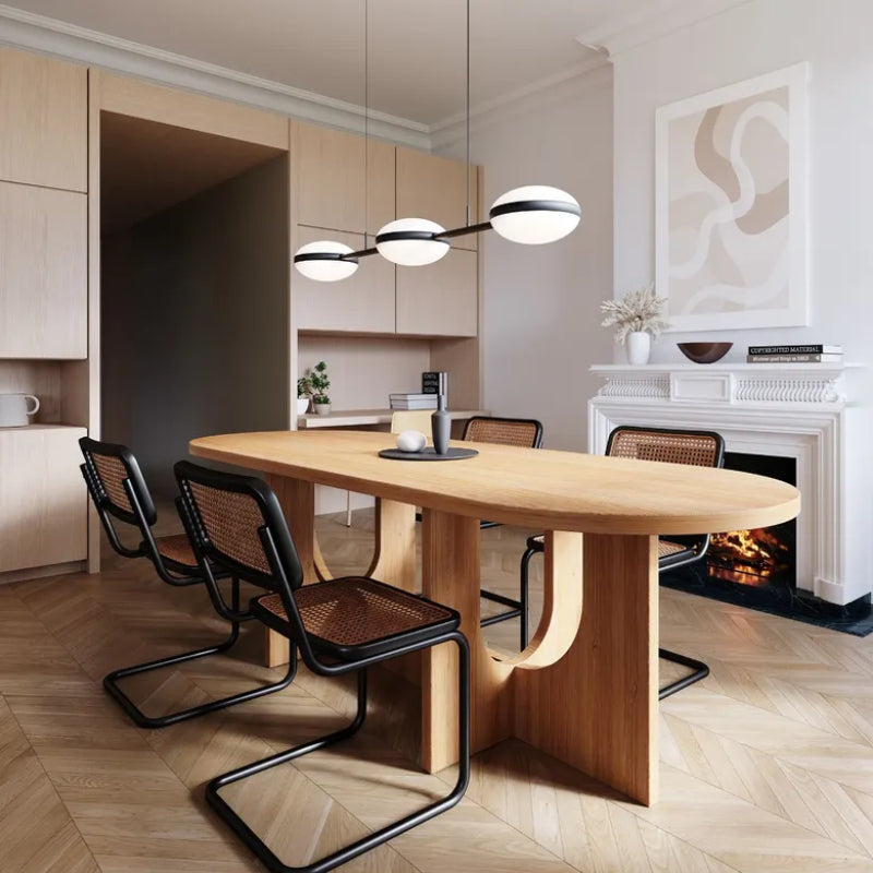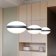 Celebrating the optical effect of calming curvilinear form and flowing metal structure, Pillows oval acrylic dome and dye-cast metal frame. Pillows chandeliers make a statement without requiring too much height, making them ideal for spaces with low ceilings. Scaled for residential, hospitality and commercial settings for an enduring modern presence.
