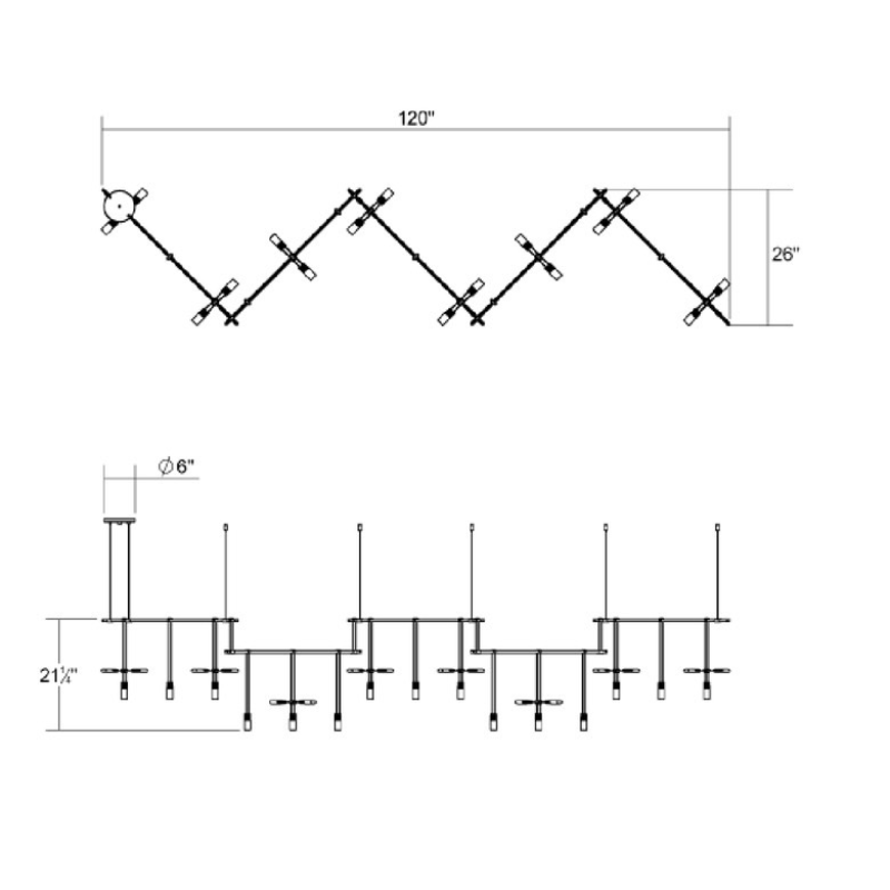 Power Bars are suspended at right angles to each other, connected by perpendicular Power Bar Hangers. Zig Zag arrangements can be used to form a linear pattern, or combined and oriented to form a broad composition arrayed across the plane of an entire ceiling.