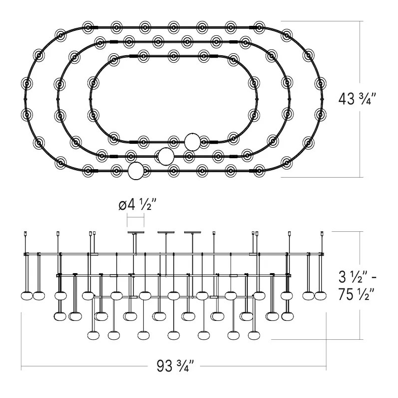 The Suspenders Path 3-Bar Racetrack configuration is one of our first Suspenders configurations to embrace softer shapes. This configuration features soft Etched Globe luminaires. The hanging height of each luminaire is adjustable, allowing for customizability for your project.