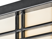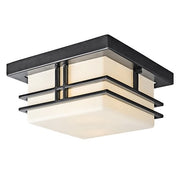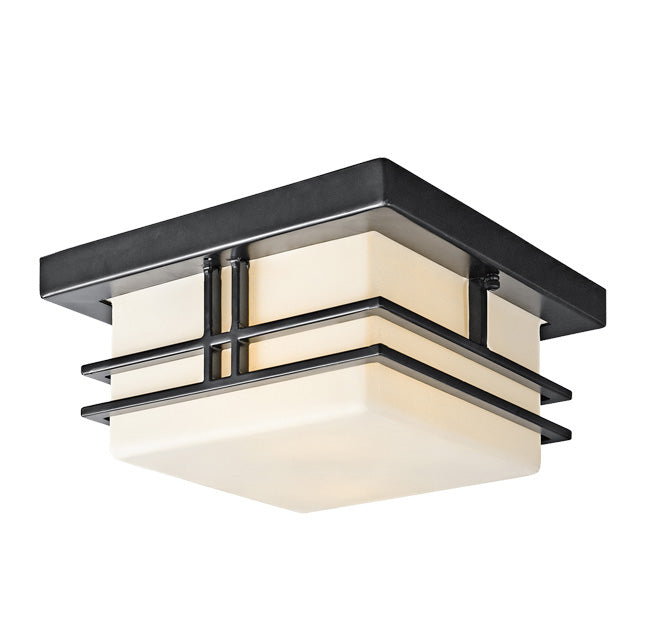 This 2 light flush mounted ceiling fixture from the Tremillo collection offers a smooth, clean profile. Double lines of Black finish form sleek perpendiculars that contrast well with the pleasant ambience of Satin Etched Cased Opal Glass. This design will mark any walkway or porch with sleek sophistication and well-balanced grandeur.