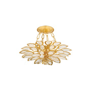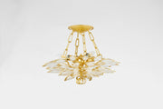Elegant tiers of sparkling hand-cut Craquelle Crystal create this highly textural and romantic fixture. Reminiscent of a peacock, the crystal are suspended within a Gold Leaf framework that brings a sparkling, luxurious quality to any space. The interplay of shapes and light from the layered silhouette, coupled with the elegant materiality, creates a striking visual display overhead.