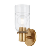 Striking the balance between hard and soft geometries, the Redding sconce features straight-edged, knurled metal work supporting one or two glass shades. The glass shades feature ribs, which transition from closely to loosely spaced and eventually fade away, mimicking ripples created by a droplet of water. Enhanced with a warm Patina Brass finish, Redding evokes an old-world feel mixed with modern simplicity.