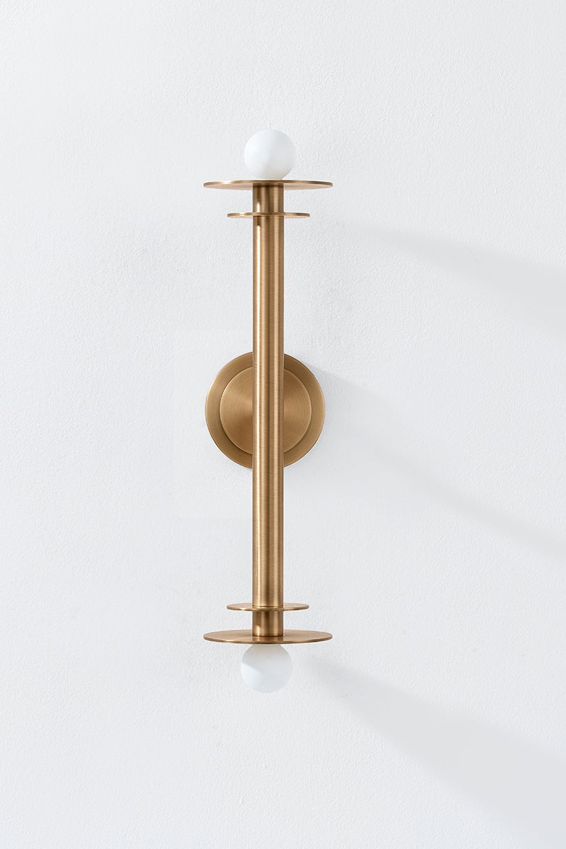 Channeling light up and down, Arley’s balanced design and circular motifs draw the eye. Two discs adorn either end of this streamlined sconce, creating an interplay of light and metal.