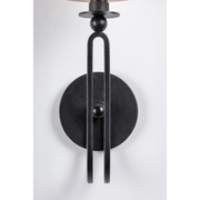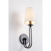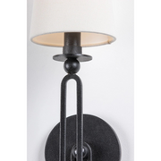 A swooping racetrack arm "hooked" over a circular backplate adds a playful freshness to this familiar sconce silhouette. Timeless materials, Forged Iron metalwork and an off-white linen shade, make this updated design useable in spaces throughout the home. Part of our Lauren Liess collection.