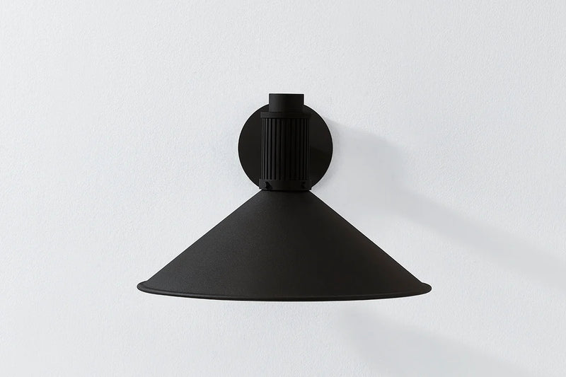 The RLM-inspired shape of Elani has been redefined for contemporary spaces with a highly durable and functional exterior design. Supported by a ribbed cap and circular backplate, the conical shade directs light downwards, illuminating entrances and walkways.