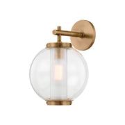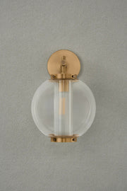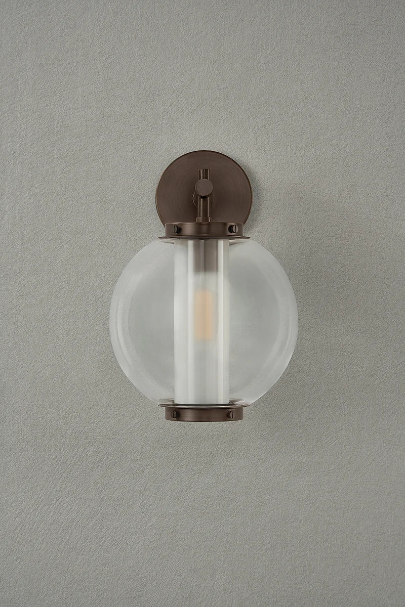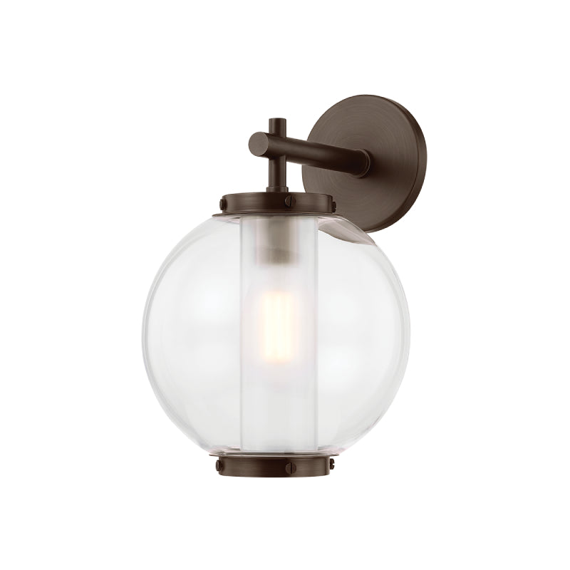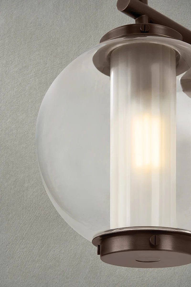 An elevated globe sconce, Marco combines curved glass and angular metalwork to create a modern, distinctive look for the outdoors. The lantern-style hanging design features a large, clear glass orb suspended from minimalist industrial fittings. Within the shade, a ribbed glass tube conceals the light source while adding a dynamic geometric layered effect.