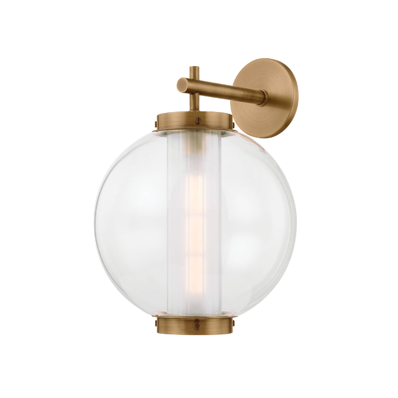 An elevated globe sconce, Marco combines curved glass and angular metalwork to create a modern, distinctive look for the outdoors. The lantern-style hanging design features a large, clear glass orb suspended from minimalist industrial fittings. Within the shade, a ribbed glass tube conceals the light source while adding a dynamic geometric layered effect.