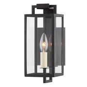 A slender, metal framework with clean, modern lines pairs with large panels of clear glass and classic candlestick bulbs to form this stately exterior wall sconce, pendant, and post. The visible rectangular backplate reflects light beautifully and both the Forged Iron and Texture Bronze finishes bring an added elegance to any outdoor setting.