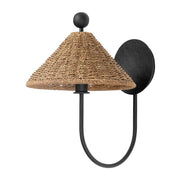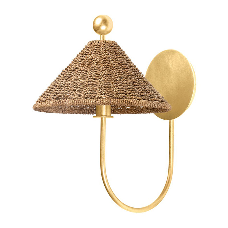 A shade of woven Lampakanay grass rests on a sleek, sweeping arm in this modern organic design. The metal orb above the shade complements the circular backplate. Both metal finishes have gorgeous texture