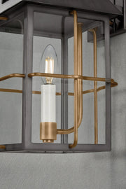 Inspired by a Cape Cod post lantern, this updated heritage sconce blends classic design features with contemporary mixed metal finishes. The Graphite frame is complemented by warm Patina Brass details, including the loop that suspends the fixture. A single cream candle lends a sense of nostalgia, welcoming you home on a dark night.