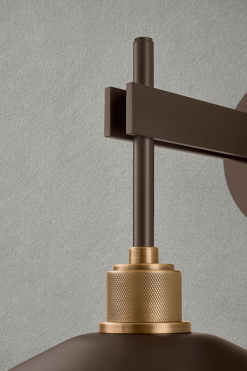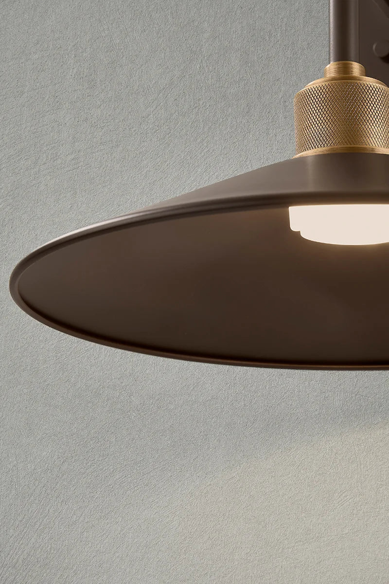 A classic RLM shade enhanced by industrial details and a mixed metal finish, the Harac sconce brings modern style to exterior walls and doorways. The Bronze finish is complemented by decorative elements like the knurled Patina Brass socket cup. Serving as a powerful downlight, Harac is available in two sizes to fulfill your outdoor lighting needs.